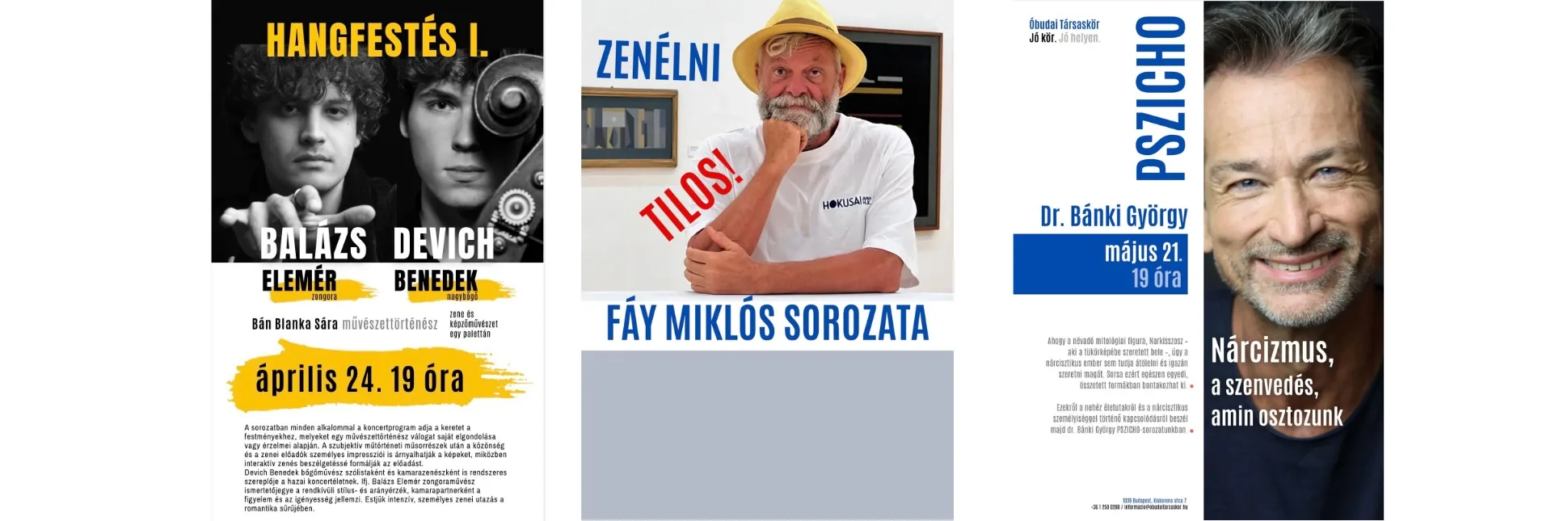 Áprilisban Hangfestés – zene és képzőművészet egy palettán című műsorfolyamunk is elindul. Az estéken a zene és a képzőművészet találkozik: a koncerthez kapcsolódó festményeket művészettörténész válogatja szubjektív érzései alapján, a közönség és az előadók pedig új színekkel festhetik meg. Az első esten Devich Benedek és ifj. Balázs Elemér játszik, a vizuális anyagot Bán Blanka Sára állítja össze.